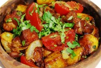 Свиная шейка, картошка, лук, помидоры, кинза, чеснок, соль, уцхо-сунели, масло