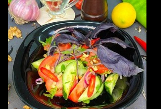 Огурцы , помидоры, перец острый (по желанию), орехи грецкие, чеснок, кинза, масло растительное (по желанию).